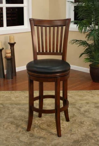 A beautiful design for kitchen counter areas, this beautiful barstool features an elegant brandy finish wood frame and fully integrated back support. The 360 degree full bearing swivel seat is generously padded with 3" of cushioning and wrapped in black vinyl. Mortise and tenon construction ensures sturdiness. Comes with floor glides and a 1 year warranty. Design by American Heritage.