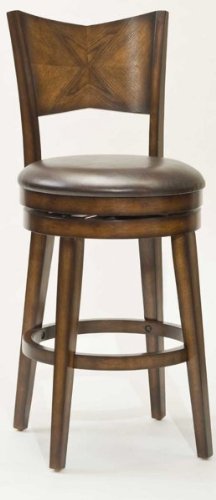 Hillsdale Furniture's Jenkins stool has a one of a kind design! Sturdy, tapered legs support an ample, round, brown vinyl seat. The stool back is inverted toward the center, enhancing the pattern of the veneer and shading of the rustic oak finish. The burnished edges add even more character to this unique swivel stool. Constructed of hardwood with veneer, some assembly required.